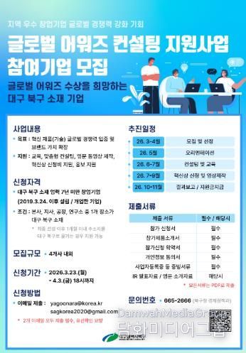 시민행정신문 강갑수 기자 | 대구 북구청은 혁신적인 기술과 제품을 보유한 지역 창업기업의 글로벌 경쟁력 강화를 돕기 위해 ‘글로벌 어워즈 컨설팅 지원사업’의 참여기업을 오는 4월 3일까지 모집한다.