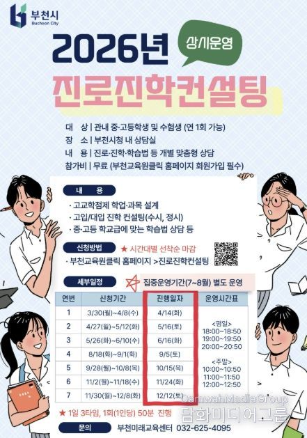 시민행정신문 강갑수 기자 | 부천시는 관내 중고등학생과 수험생의 자기주도적 진로 설계 역량을 강화하고 급변하는 입시 환경에 선제적으로 대응하기 위해 4월부터 ‘2026년 진로진학컨설팅’을 상시 운영한다.