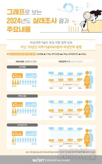 시민행정신문 강갑수 기자 | 과학기술정보통신부와 한국여성과학기술인육성재단(WISET)은 전국 5,138개 과학기술분야 연구기관의 성별 R&D인력 활용 현황을 종합적으로 조사·분석한 '2024년도 여성과학기술인력 활용 실태조사' 보고서를 발간했다.