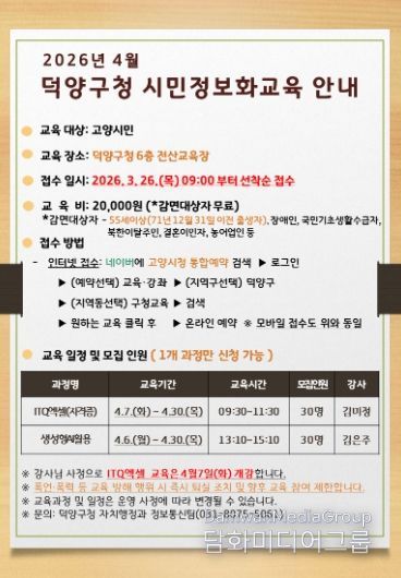 교육은 4월 6일부터 30일까지 덕양구청 전산 교육장에서 진행되며, 수강 신청은 3월 26일 목요일 오전 9시부터 덕양구청 통합예약 누리집을 통해 온라인으로 접수할 수 있다.
