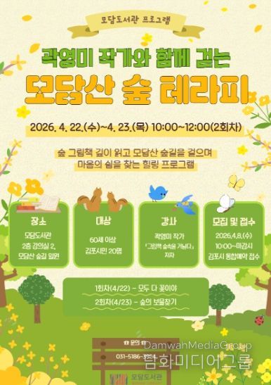 시민행정신문 기자 | 김포시 모담도서관은 오는 4월 22일, 4월 23일 오전 10시부터 12시까지 모담도서관 2층 강의실과 모담산 숲길에서 힐링 프로그램 '곽영미 작가와 함께 걷는 모담산 숲 테라피'를 운영한다.