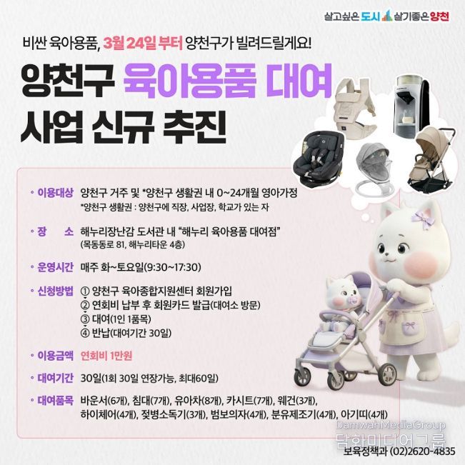 이용 대상은 양천구에 거주하거나 양천구에 직장, 사업장, 학교 등 생활권을 두고 있는 0~24개월 영아 가정으로, 연회비 1만 원만 부담하면 모든 육아용품을 대여할 수 있다.