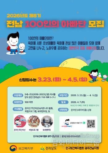 윤연화 전남도 인구청년이민국장은 “아빠의 육아 참여는 아이의 건강한 성장뿐 아니라 가족 전체의 행복과 직결된다”며 “전남 100인의 아빠단을 통해 아빠와 아이가 함께하는 일상의 소중함을 경험하고, 지역사회 전반에 가족 친화적 문화가 확산하길 기대한다”고 말했다.