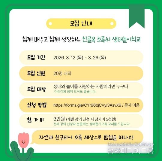 모집기간은 오는 26일까지이며, 생태와 놀이에 관심 있는 누구나 신청 가능하다. 모집인원은 20명 내외로, 참가비는 3만원이며 개별 강의 신청도 가능하다.