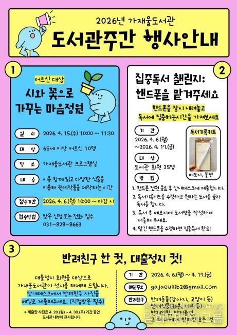 이 외에도 대출정지 회원을 위한 이벤트 ‘반려친구 한 컷, 대출정지 컷!’도 진행한다. 반려친구 사진을 이메일로 제출하면 대출정지를 해제하는 행사로, 반려친구의 범위는 반려동물뿐만 아니라 반려식물, 반려인형, 반려물건 등 개인에게 의미 있는 대상까지 폭넓게 포함한다. 자세한 사항은 도서관 누리집을 참고하거나 가재울도서관(031-828-8663)으로 문의하면 안내받을 수 있다.