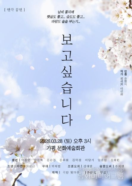 군은 오는 28일 오후 3시 가평문화예술회관에서 연극 전문 극단 툇마루의 대표작 ‘보고싶습니다’를 무료로 상연한다고 밝혔다.