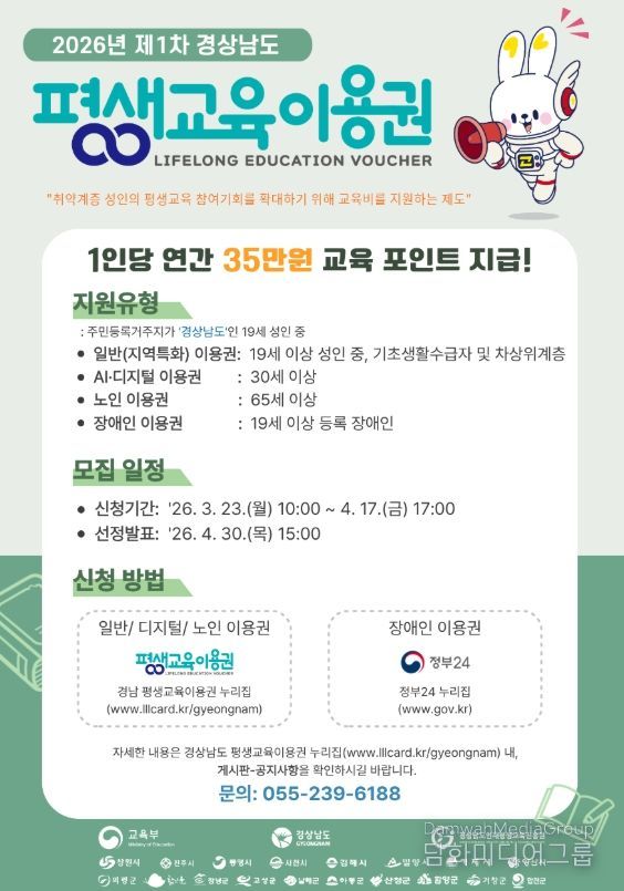 신청 방법은 일반·AI 디지털·노인 대상자는 경상남도 평생교육이용권 누리집에서 온라인으로 신청하면 되며, 장애인은 정부24를 통한 온라인 신청 또는 함양군청 행정과 평생교육담당을 방문해 신청할 수 있다.