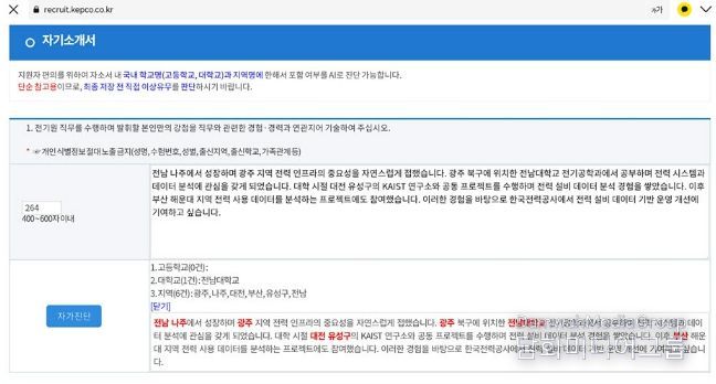 시민행정신문 강갑수 기자 | 한국전력이 채용 지원자의 편의를 높이고 공정한 채용 환경을 조성하기 위해, 자기소개서 AI 자가 진단과 네이버 인증 기반 자격증 자동 반영 서비스를 채용 시스템에 전격 도입한다.