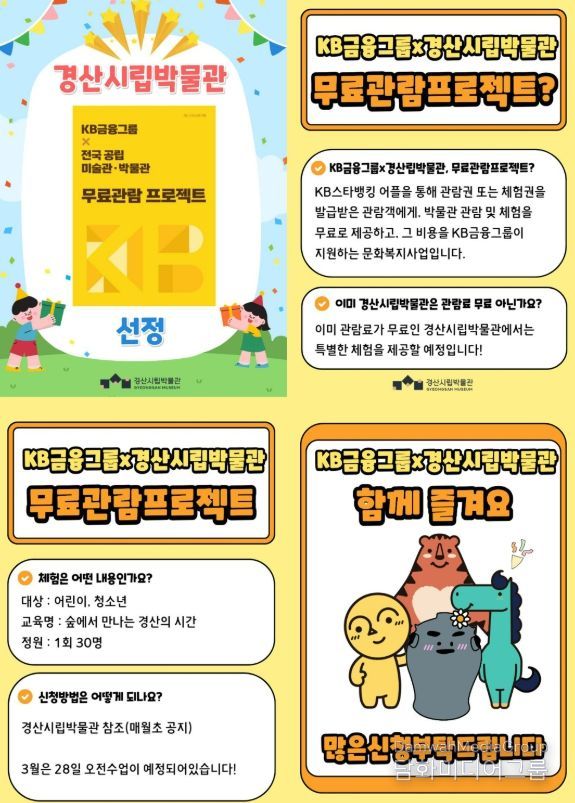 시민행정신문 기자 | 경산시 시립박물관은 KB금융그룹이 추진하는 ‘전국 공립 미술관·박물관 무료 관람 프로젝트’에 선정되어, 어린이~성인 대상 체험교육 프로그램을 운영한다고 밝혔다.