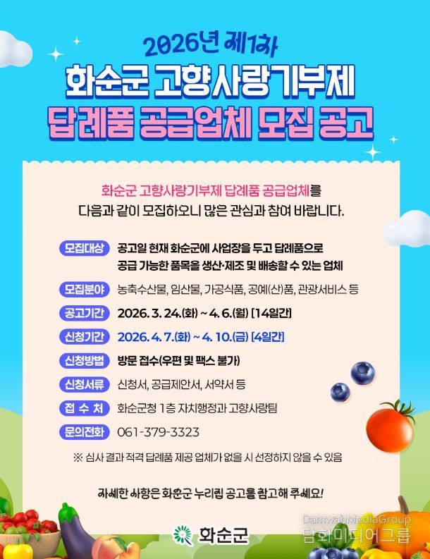 시민행정신문 강갑수 기자 | 화순군은 24일 고향사랑기부제 활성화와 기부자 만족도 제고를 위해 2026년 제1차 고향사랑기부제 답례품 및 공급업체를 모집한다고 밝혔다.
