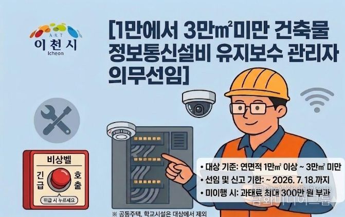 시민행정신문 강갑수 기자 | 이천시는 관내 일정 규모 이상의 건축물 소유자 및 관리주체를 대상으로 ‘정보통신설비 유지보수·관리자 선임 및 신고’를 철저히 이행해 줄 것을 당부했다.