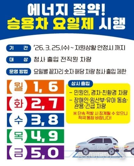 승용차 요일제는 청사에 출입하는 모든 차량을 대상으로 운영되며, 차량 번호 끝자리 숫자에 따라 해당 요일 청사 출입이 제한된다. 요일별 적용 기준은 ▲월요일 1·6 ▲화요일 2·7 ▲수요일 3·8 ▲목요일 4·9 ▲금요일 5·0이다.