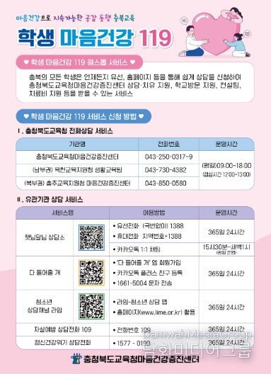 시민행정신문 기자 | 충청북도교육청은 새 학기를 맞아 학생들이 새로운 환경에 안정적으로 적응하고 건강하게 성장할 수 있도록 '학생 마음건강 119' 서비스를 상시 운영하며 학생 마음건강 지원을 강화하고 있다고 밝혔다.