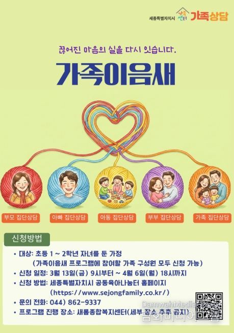 시민행정신문 강갑수 기자 | 세종특별자치시가족센터가 내달 6일까지 가족 구성원의 유대감을 강화하는 집단상담 프로그램 ‘가족이음새’ 참가자를 모집한다.