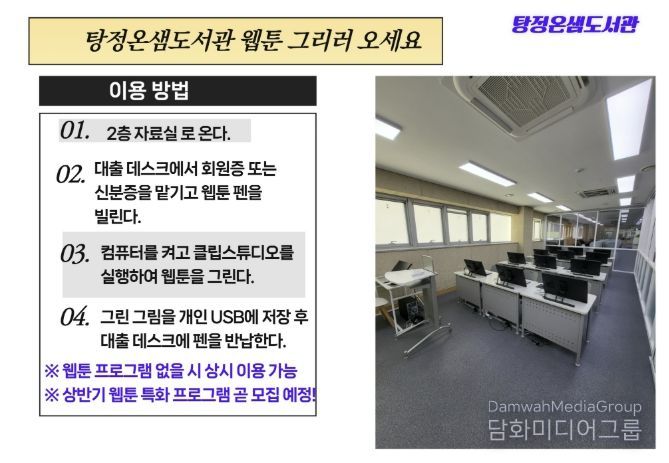 탕정온샘도서관은 그동안 웹툰 특화 프로그램 운영을 통해 시민들의 큰 호응을 얻어왔으며, 웹툰창작실 조성을 통해 단순한 독서를 넘어 ‘창작 중심의 도서관’으로 한 단계 도약할 것으로 기대된다.