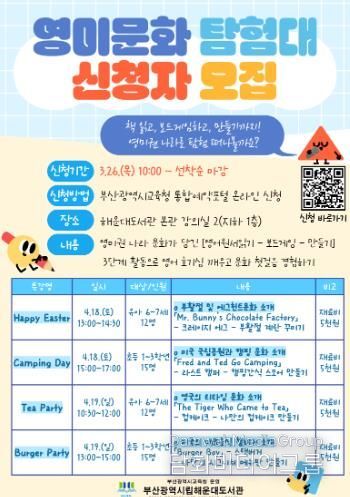 시민행정신문 기자 | 부산광역시립해운대도서관은 오는 4월 18일과 19일 해운대도서관에서 6~7세 유아와 1~3학년 초등학생 50여 명을 대상으로 영미문화 체험 특강 ‘영미문화 탐험대’를 운영한다.