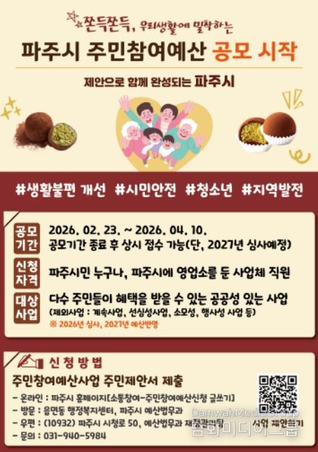 시민행정신문 강갑수 기자 | 파주시는 2027년도 예산 편성에 반영할 주민참여예산 시민 제안을 오는 4월 10일까지 접수한다.