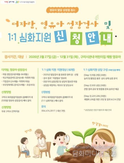 한편 시는 사업 추진 과정과 성과를 지속적으로 점검해 영유아 발달 지원 체계를 고도화할 계획이다. 관련 문의는 구미시육아종합지원센터로 하면 된다.