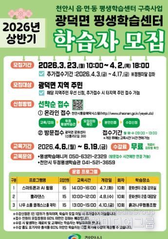 신청을 원하는 시민은 다음 달 2일까지 천안시 통합예약시스템 또는 해당 지역 평생학습센터를 방문해 신청하면 된다.