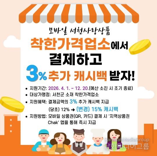 이번 사업에 따라 착한가격업소에서 모바일(카드) 서천사랑상품권으로 결제할 경우, ‘지역사랑상품권 Chak’ 앱을 통해 결제금액의 3%를 추가 캐시백으로 지원받을 수 있다.