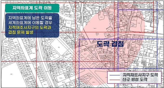 사업은 수치지역의 경우 세계측지계 좌표에 맞는 도곽을 새로 생성하고, 도해지역은 좌표 오류를 정비하는 방식으로 추진되며, 도곽 위치 변동에 따른 필지 속성 정보도 함께 정비할 계획이다.