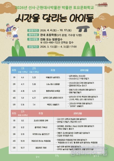 시민행정신문 강갑수 기자 | 양구 선사·근현대사박물관은 4월 4일부터 10월 17일까지 초등학생을 대상으로 토요문화학교 ‘시간을 달리는 아이들’을 운영한다.