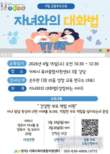 시민행정신문 강갑수 기자 | 거제시 육아종합지원센터는 영유아 자녀를 둔 가정을 대상으로 오는 4월 15일에 실시하는 공통부모교육‘성장하는 아이–자녀와의 대화법’ 참여자를 모집한다.