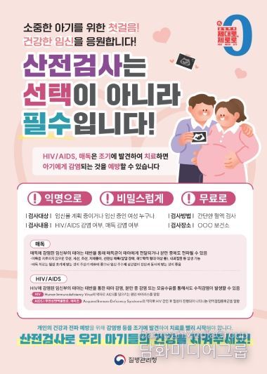 이미 임신 중인 여성을 위한 ‘임신 초기 산전 검사’는 B형간염(항원, 항체), 매독, 에이즈, 전혈구 검사 포함 4종을 연중 실시한다. 예비맘 검사는 신분증을, 임신 초기 검사는 신분증과 임신확인증을 지참해 보건소 모자보건실로 방문하면 된다.