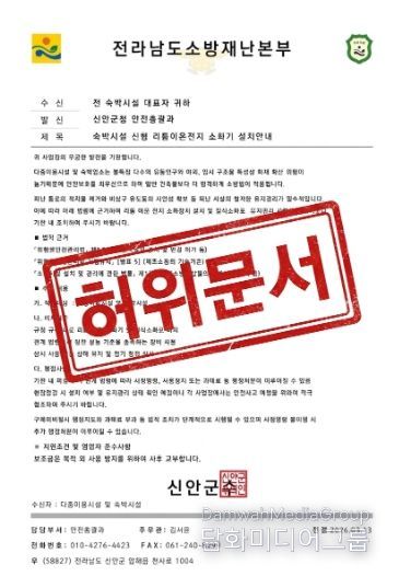 최근 신안군 에서는 관내 숙박시설에 대해 “숙박시설 신형 리튬이온전지 소화기 설치 안내”라는 제목으로 신안군청 안전총괄과 발신으로 관내 숙박시설 대표자들을 수신자로 발송됐다.