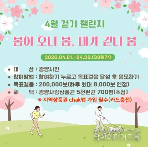 시민행정신문 강갑수 기자 | 광양시는 오는 4월 1일부터 4월 30일까지 건강걷기 실천 모바일 걷기앱 워크온을 통해 ‘봄이 오나 봄, 내가 걷나 봄! 4월 걷기 챌린지’를 운영한다고 밝혔다.