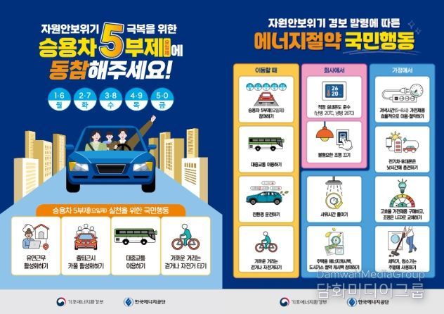 정부가 주도하는 공공기관 승용차 5부제는 이날부터 의무 시행된다. 중앙정부와 지방자치단체, 정부 산하 공공기관, 지자체 공공기관, 국공립대, 국립병원, 시도교육청 등이 대상이다.
