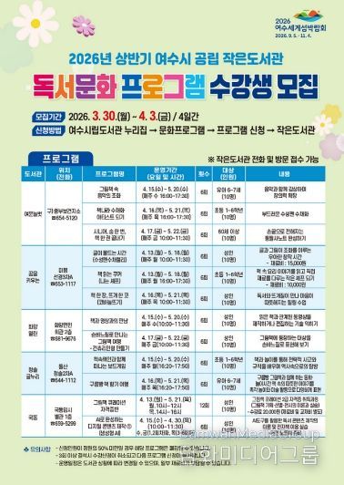 시민행정신문 강갑수 기자 | 여수시는 오는 3월 30일부터 4월 3일까지 공립 작은도서관 ‘2026년 상반기 독서문화 프로그램’ 수강생을 모집한다고 밝혔다.
