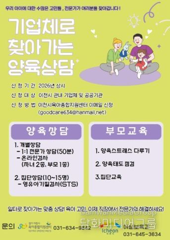 이천시 육아종합지원센터 관계자는 “아이를 키우는 부모라면 누구나 고민이 있지만, 직장 생활로 인해 상담의 기회를 놓치는 경우가 많다”라며, “직접 찾아가는 서비스를 통해 부모의 양육 부담을 덜고, 건강한 양육 환경을 조성하는 데 최선을 다하겠다”라고 전했다.