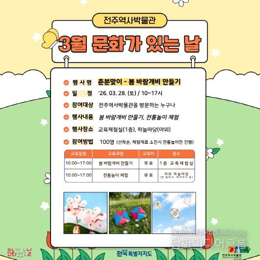 전주역사박물관 관계자는 “이번 춘분맞이 행사가 봄의 따뜻한 기운 속에서 온 가족이 함께 즐기는 소중한 시간이 되길 바란다”면서 “앞으로도 매달 다양한 문화 체험의 기회를 드릴 수 있도록 알찬 프로그램을 준비하겠다”고 말했다.