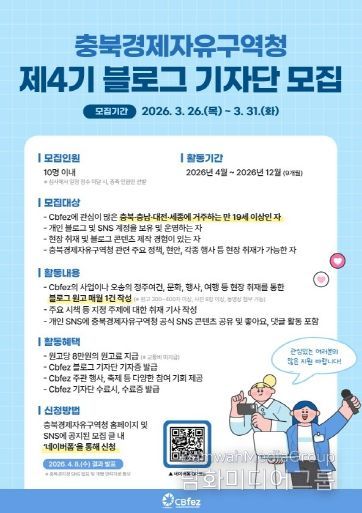 이러한 성공 DNA를 이어받아 충북경제자유구역의 미래 가치를 발굴하고 전파할 제4기 블로그 기자단의 모집 인원은 10명 이내로, 모집 기간은 2026년 3월 26일부터 3월 31일까지 6일간 진행된다.