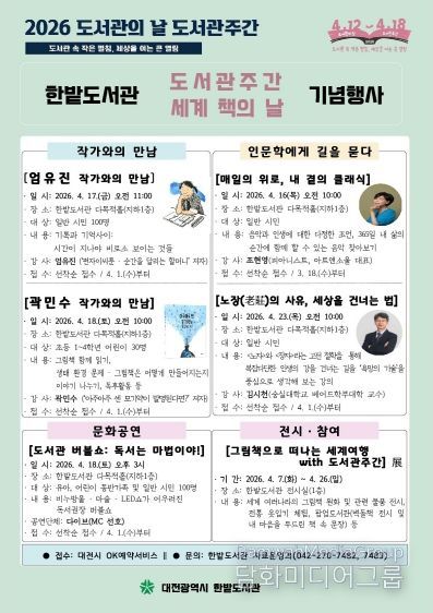 시민행정신문 기자 | 한밭도서관은 도서관 주간(4월 12일~18일)과 세계 책의 날(4월 23일)을 맞이하여 시민들의 독서 문화 확산과 문화 향유 기회 확대를 위해 다양한 프로그램을 운영한다.