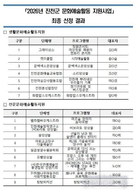이번 사업은 총 5천800만 원 규모로 운영되며, 선정된 단체들은 사업 유형과 규모에 따라 활동비를 지원받아 오는 4월부터 11월까지 진천군 전역에서 공연, 전시, 교육 등 다양한 문화예술 프로그램을 선보일 예정이다.