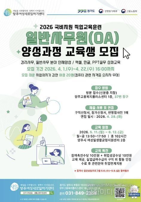 시민행정신문 강갑수 기자 | 양주시가 오는 4월 1일부터 4월 22일까지 양주여성새로일하기센터에서 직업교육훈련 ‘일반사무원(OA) 양성과정’ 교육생을 모집한다.