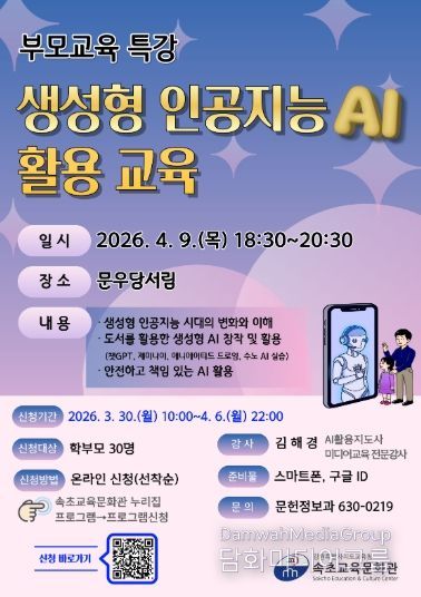 시민행정신문 기자 | 속초교육문화관은 4월 9일 오후 6시 30분, 지역 서점 문우당서림 2층에서 2026년 부모교육 특강 ‘생성형 인공지능(AI) 활용’을 운영한다.