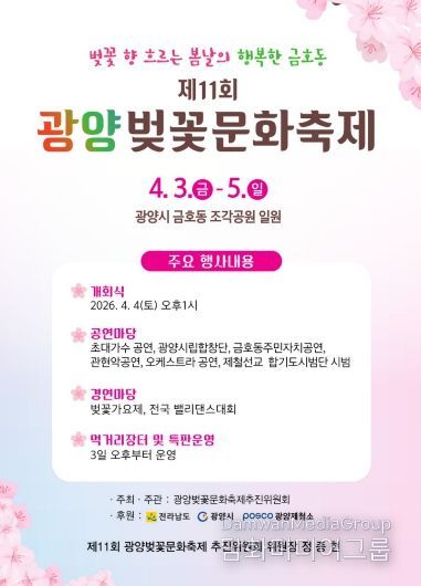 시민행정신문 강갑수 기자 | 광양시 금호동은 오는 4월 3일부터 4월 5일까지 금호동 조각공원 일원에서 3일간 제11회 광양벚꽃문화축제를 개최한다고 밝혔다.