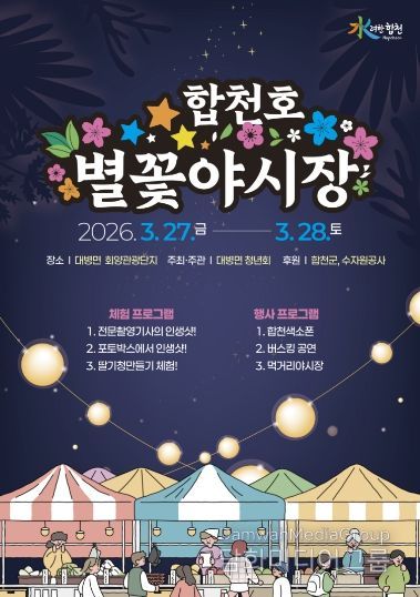 시민행정신문 기자 | 합천군 대병면청년회 주최/주관으로 '2026년 합천호 별꽃야시장 축제'가 합천군 대병면 회양관광단지일원에서 27일부터 28일 이틀간 (오후3시~저녁10시)까지 개최된다.