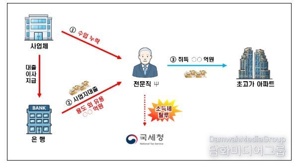 실제 고소득 전문직 사업자가 강남권 고가 아파트를 ○○여억 원에 취득하면서 ○○억 원의 사업자 대출금과 ○○억 원의 신고누락된 탈루자금을 사용한 것으로 드러났으며, 수년간 ○억 원에 달하는 사업자 대출 관련 이자를 경비 계상하여 탈세한 사실도 확인됐다.