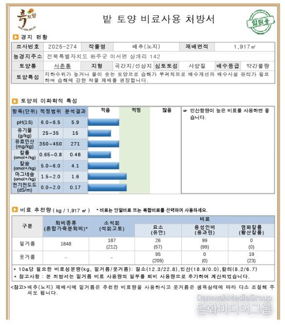 농촌진흥청은 토양환경정보시스템 ‘흙토람’에서 246작물의 비료사용처방서를 제공하고 있다. 작물을 아주심기(정식) 하기 전 토양을 채취해 가까운 농업기술센터에 분석을 의뢰하면 토양 양분 상태에 맞는 퇴비와 액비 사용량을 알려준다. 또한, 농가가 안심하고 퇴비, 액비를 사용할 수 있도록 농업기술센터에서 자가 퇴비의 부숙도와 액비 성분을 분석해 알려주고 있다.