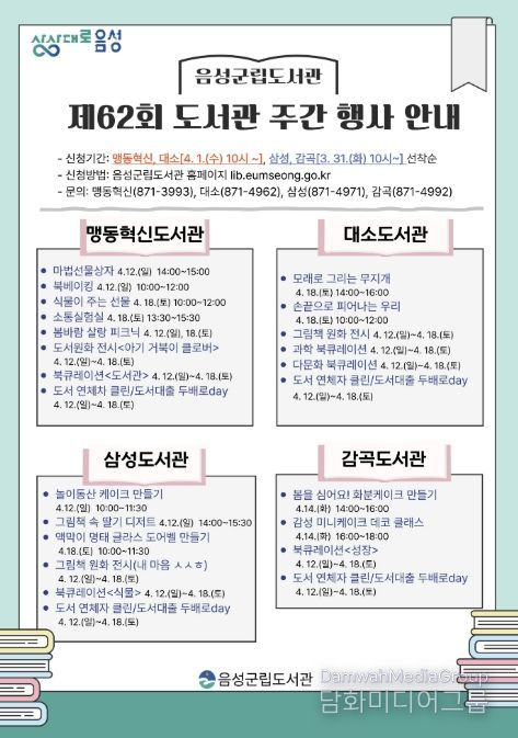 시민행정신문 기자 | 음성군립도서관(맹동혁신,대소,삼성,감곡)에서는 제62회 도서관 주간을 맞이해 오는 4월 12일부터 ‘도서관 속 작은 펼침, 세상을 여는 큰 열림’이라는 주제로 음성군립도서관 이용자 대상 각종 독서·문화 행사를 개최한다.