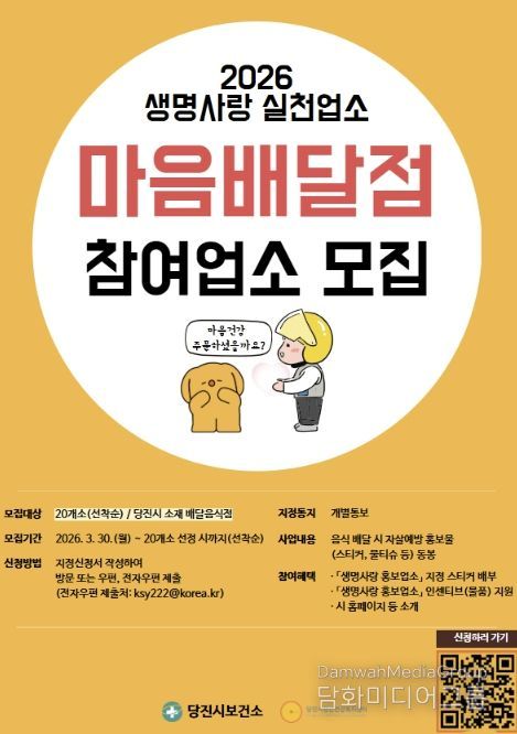 시민행정신문 기자 | 당진시는 지역사회 내 자살 예방 안전망 구축과 1인 가구의 정신건강 위기 극복을 위해 오는 30일부터 2026년 ‘마음배달점’ 신규 참여 업소를 모집한다고 27일 밝혔다.