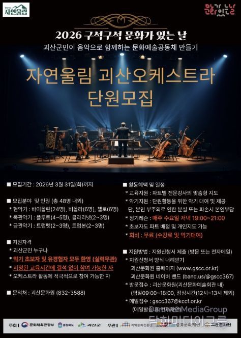 시민행정신문 강갑수 기자 | 충북 괴산문화원은 문화체육관광부와 충청북도, 괴산군이 후원하는 2026년 ‘구석구석 문화가 있는 날’ 사업과 연계해 ‘자연울림 괴산오케스트라’를 창단하고 함께할 단원을 모집한다고 27일 밝혔다.
