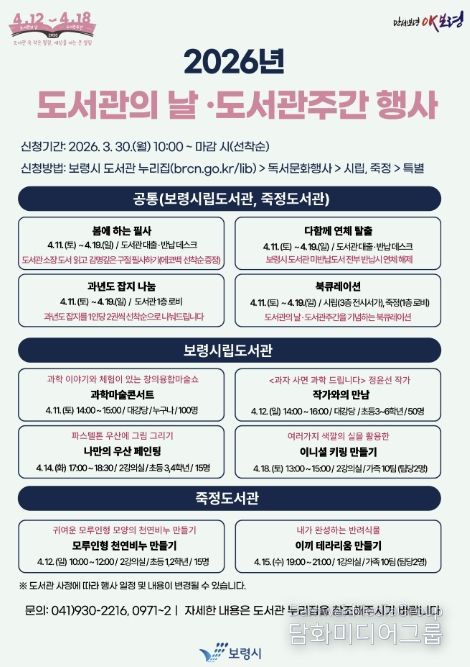 시민행정신문 기자 | 보령시는 2026년 도서관의 날·도서관주간을 맞아 보령시 도서관에서 공연, 강연, 체험, 독서 이벤트 등 다채로운 문화행사를 진행한다고 27일 밝혔다.