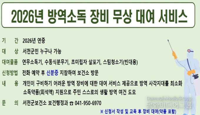대여 대상은 서천군민 누구나 가능하며, 대여 장비는 연무소독기, 수동식 분무기, 초미립자 살포기, 스팀청소기(빈대용) 등 총 4종이다.