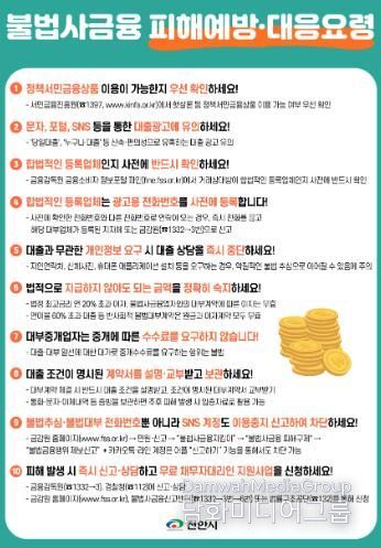 시민행정신문 강갑수 기자 | 천안시가 민생 경제를 위협하는 불법사금융으로부터 시민을 보호하기 위해 제도적 대응과 홍보에 나섰다.