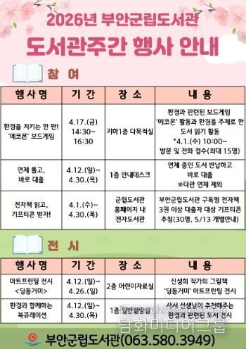시민행정신문 강갑수 기자 | 부안군립도서관은 2026년 도서관의 날(4월 12일)과 도서관주간(4월 12~18일)을 맞아 지역 주민들을 위한 다채로운 독서 문화 행사를 운영한다고 밝혔다.